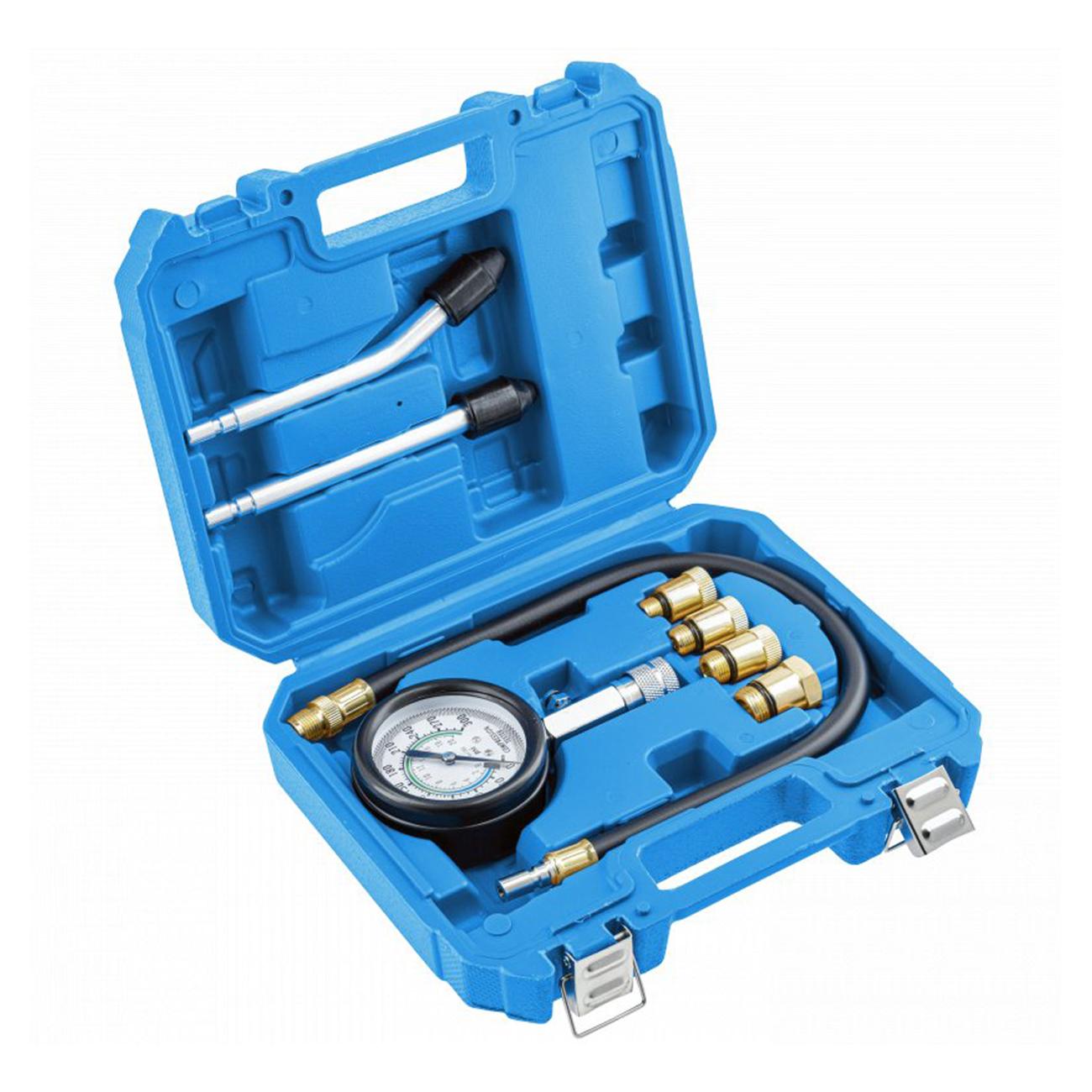 Это профессиональный аналоговый манометр для определения давления сжатия в цилиндрах бензиновых двигателей. Комплект поставляется с разнообразными адаптерами и шлангами, которые обеспечивают удобное подключение в условиях сервиса.