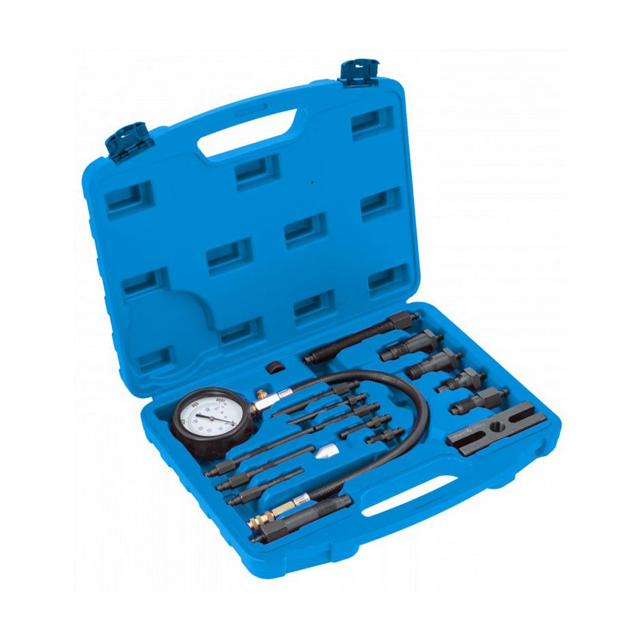 Это профессиональный комплект для измерения давления сжатия в цилиндрах дизельных двигателей — как легковых автомобилей, так и коммерческого транспорта. Манометр с шлангом 70 бар/340 мм и набор из 16 адаптеров обеспечивает универсальность использования. Удобно применять в автосервисах и профессиональных мастерских.