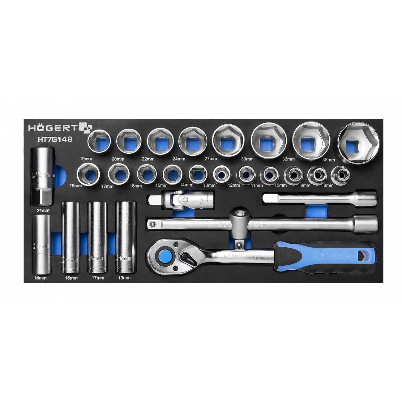 • Головки 1/2 (19 шт): 8, 9, 10, 11, 12, 13, 14, 15, 16, 17, 18, 19, 21, 22, 24, 27, 30, 32, 36 мм