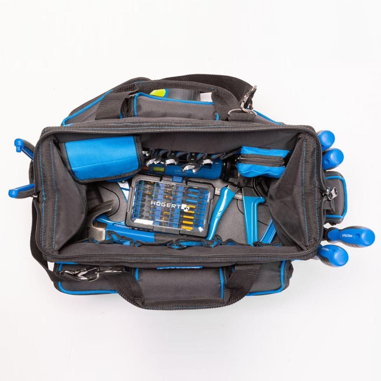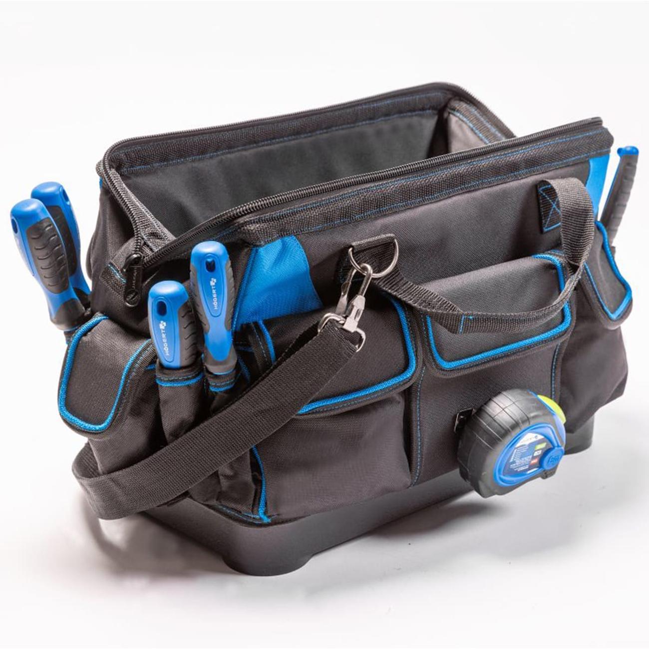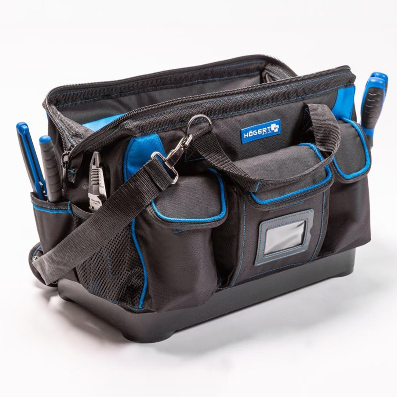 Сумка — сочетание прочности и функционального дизайна. Прочная и продуманная по деталям сумка для инструментов. Сочетает лёгкость, вместимость и удобство хранения для профессиональной и домашней работы. Отличный выбор для тех, кто ценит организацию, надёжность и качество в одном аксессуаре. Изготовлена из высококачественного полиэстера 600D, дополнена усиленным пластиковым дном, обеспечивающим устойчивость и долговечность. При весе около 1,55 кг, размеры — 41 × 23,5 × 31 см.