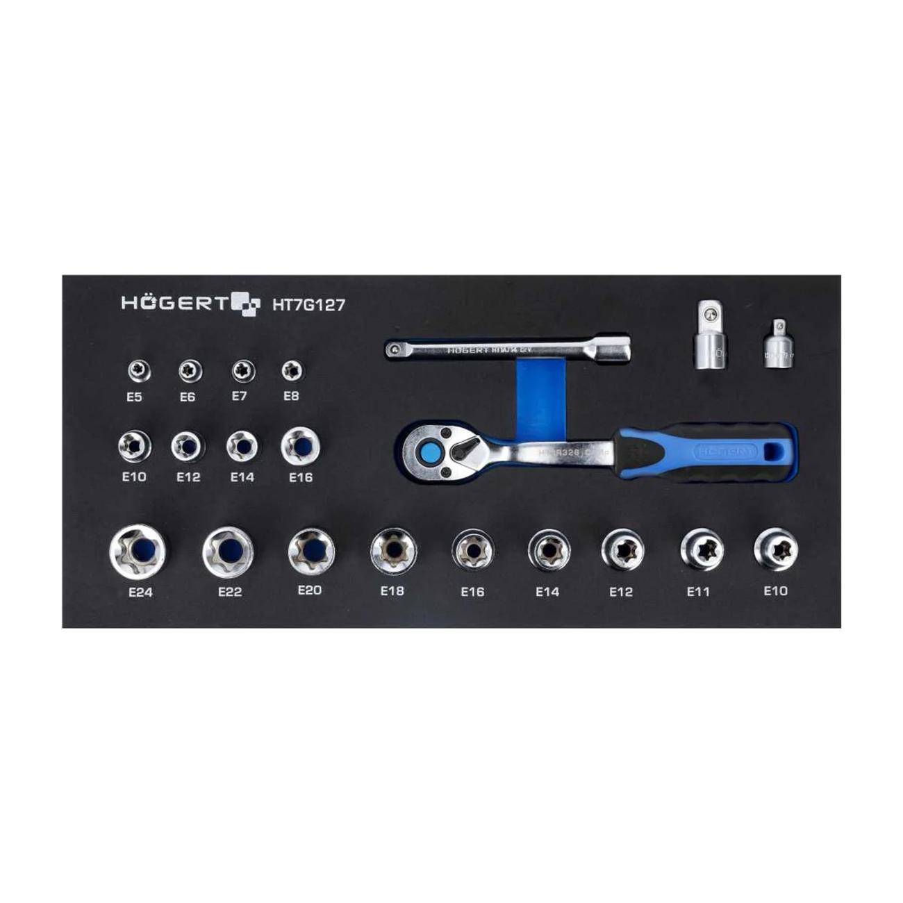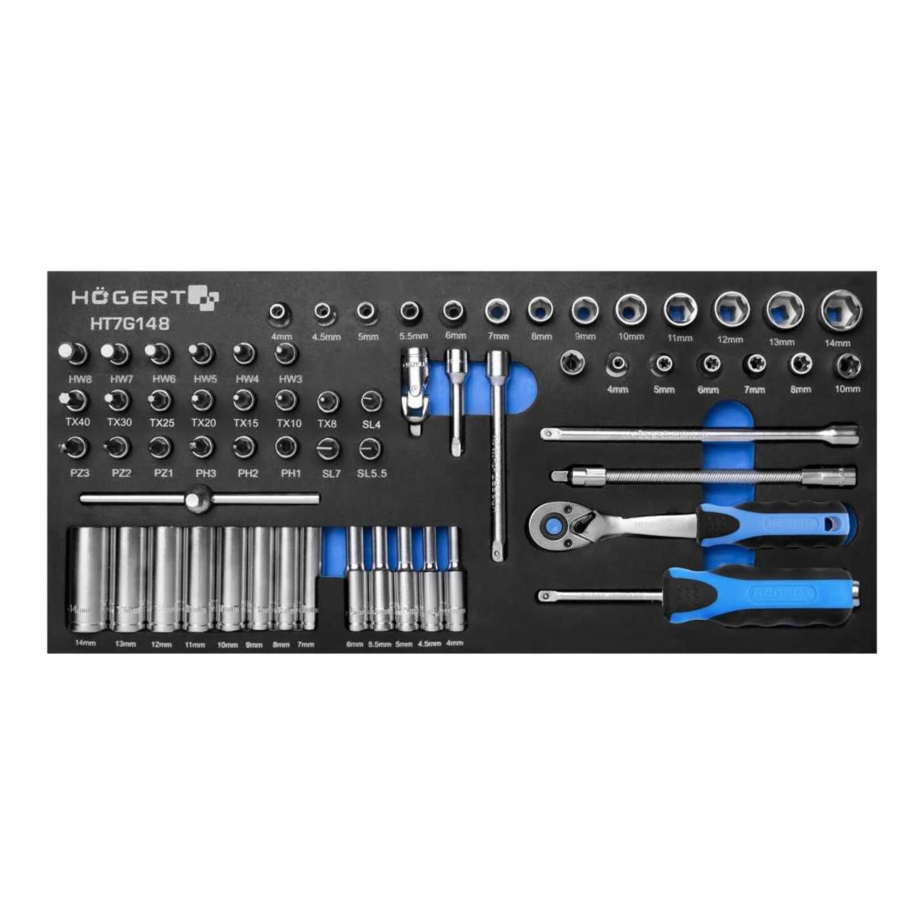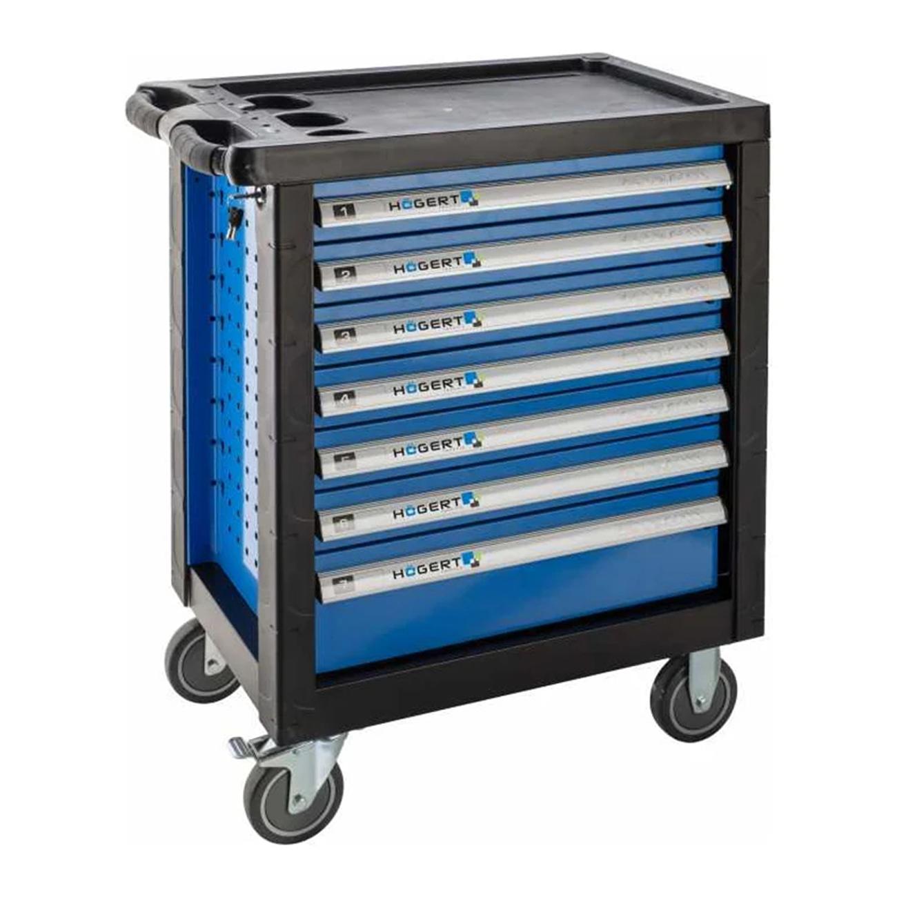 Продуманный мобильный шкаф-тележка с комплектом ручных инструментов (252 шт.), предназначенный для автосервисов, мастерских и гаражей. Оснащён семью выдвижными ящиками: шесть по 75 мм и один глубокий на 154 мм. Вверх — усиленная ABS‑панель. Прочные колёса на подшипниках (диаметр 5 × 1,24″), два из них — поворотные, с возможностью блокировки. Имеется центральный замок с ключом (в комплекте два ключа). Удобная организация инструментов в EVA-ложементах.