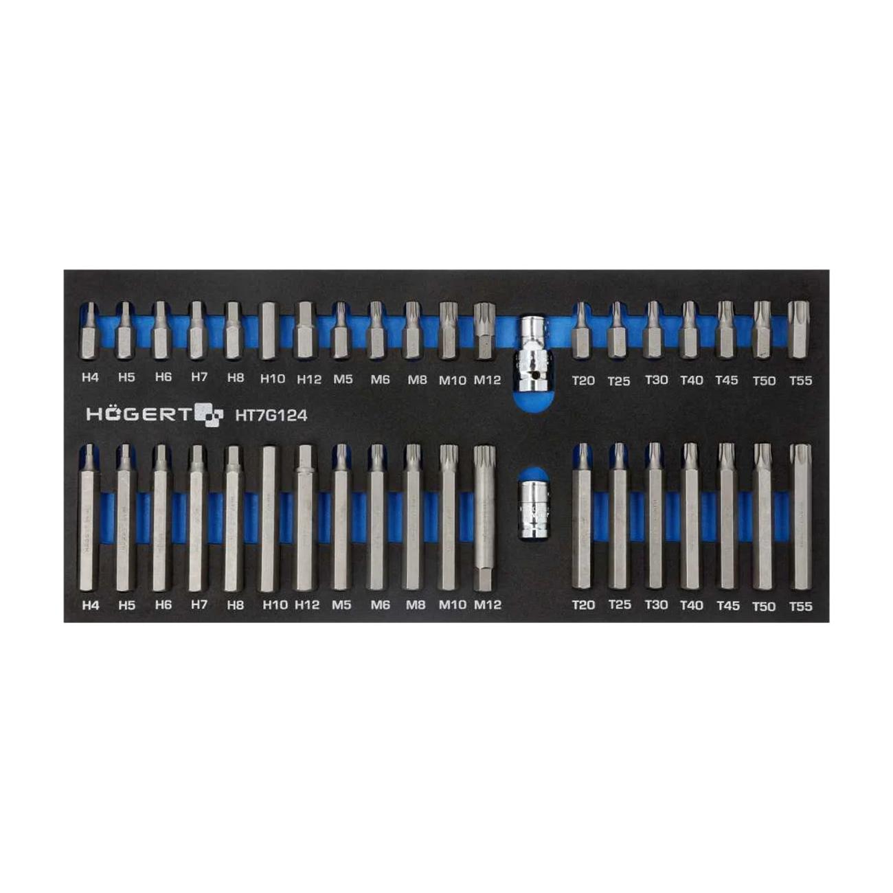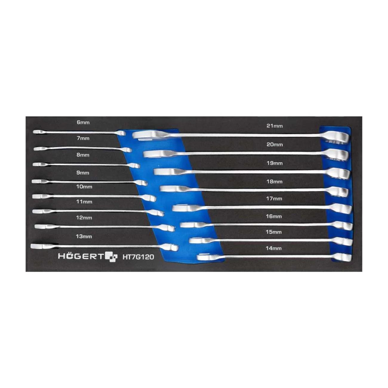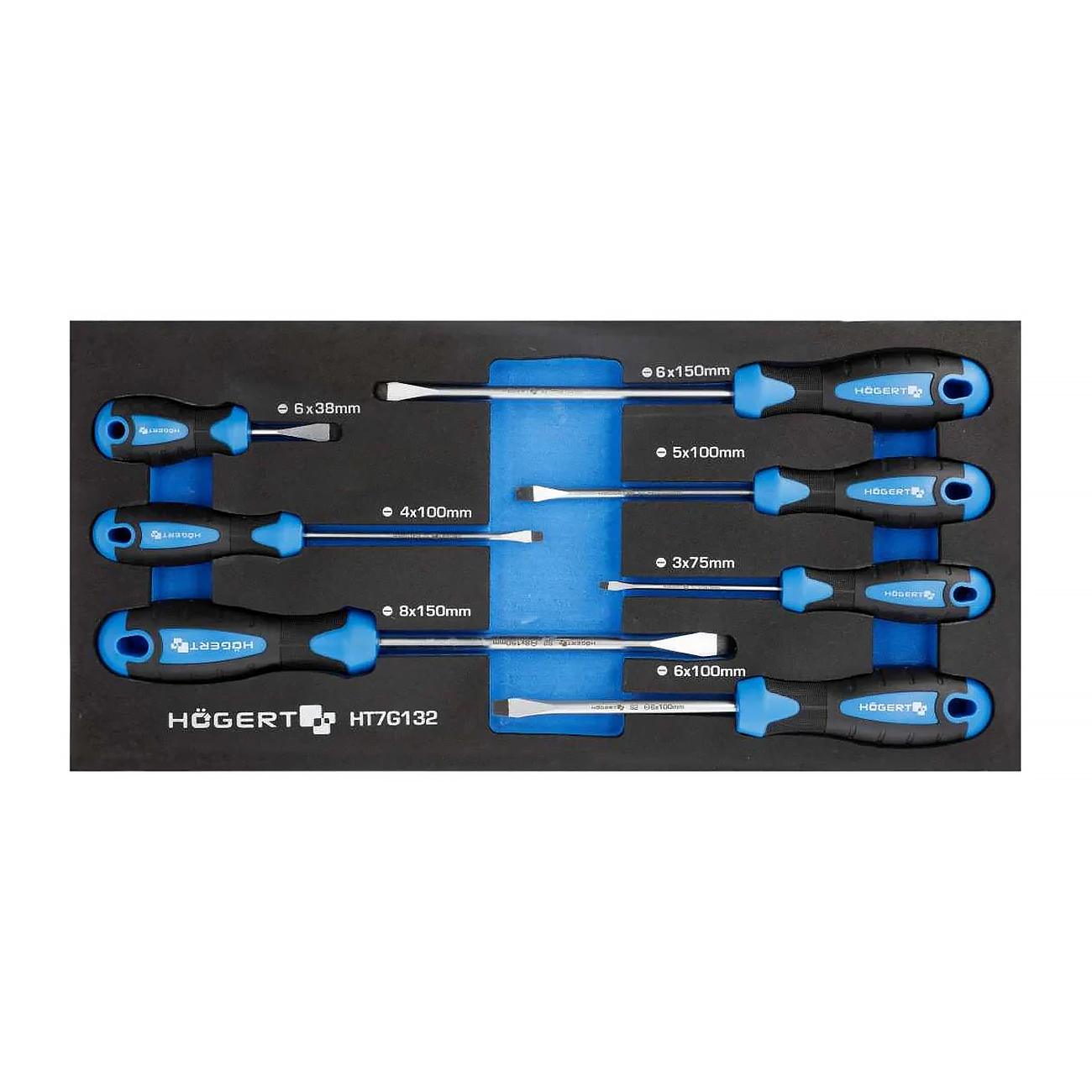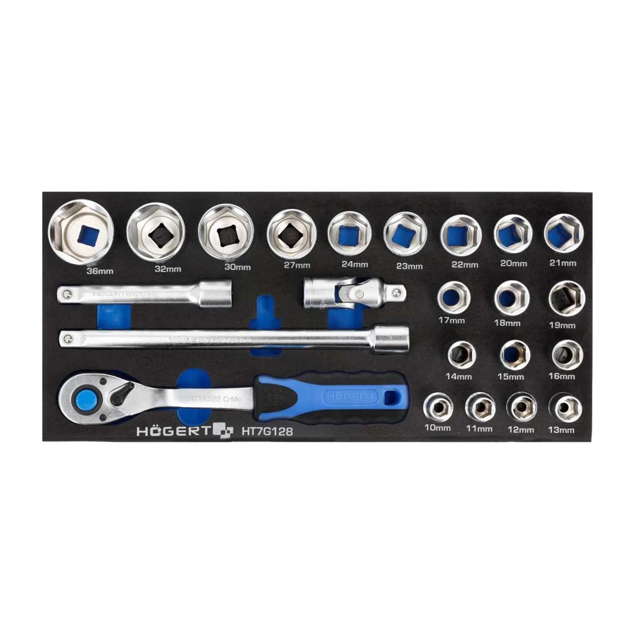 Продуманный мобильный шкаф-тележка с комплектом ручных инструментов (252 шт.), предназначенный для автосервисов, мастерских и гаражей. Оснащён семью выдвижными ящиками: шесть по 75 мм и один глубокий на 154 мм. Вверх — усиленная ABS‑панель. Прочные колёса на подшипниках (диаметр 5 × 1,24″), два из них — поворотные, с возможностью блокировки. Имеется центральный замок с ключом (в комплекте два ключа). Удобная организация инструментов в EVA-ложементах.