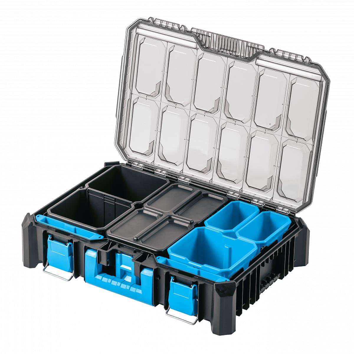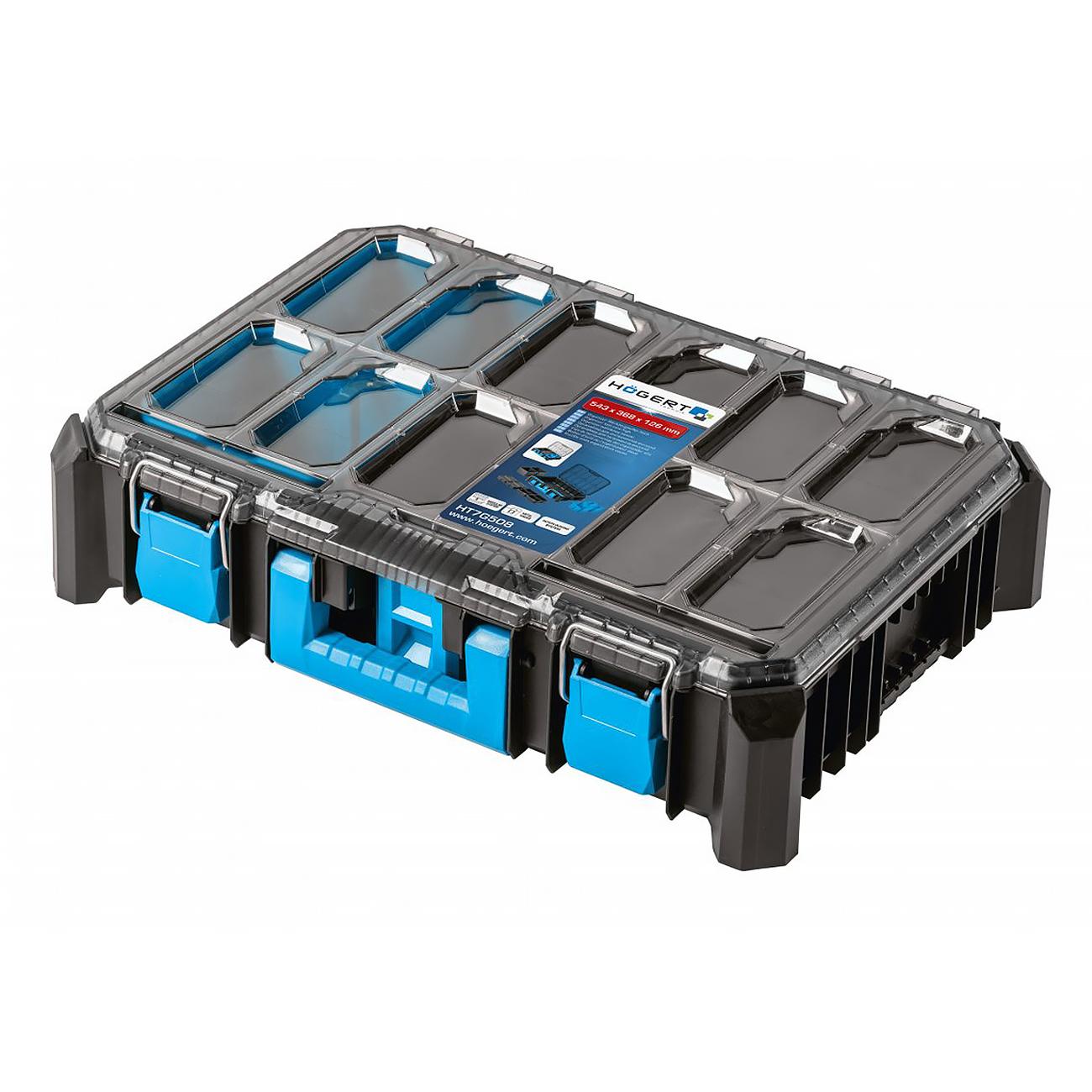 Это модульный suitcase-органайзер со съемной прозрачной крышкой из поликарбоната, предназначенный для безопасного хранения и транспортировки мелкого инструмента и аксессуаров. Корпус выполнен из ударопрочных полимеров, а крепежи и петли — из ABS-пластика и металла, что обеспечивает надёжность и долговечность. Дизайн совместим с другими элементами модульной системы Högert Technik.