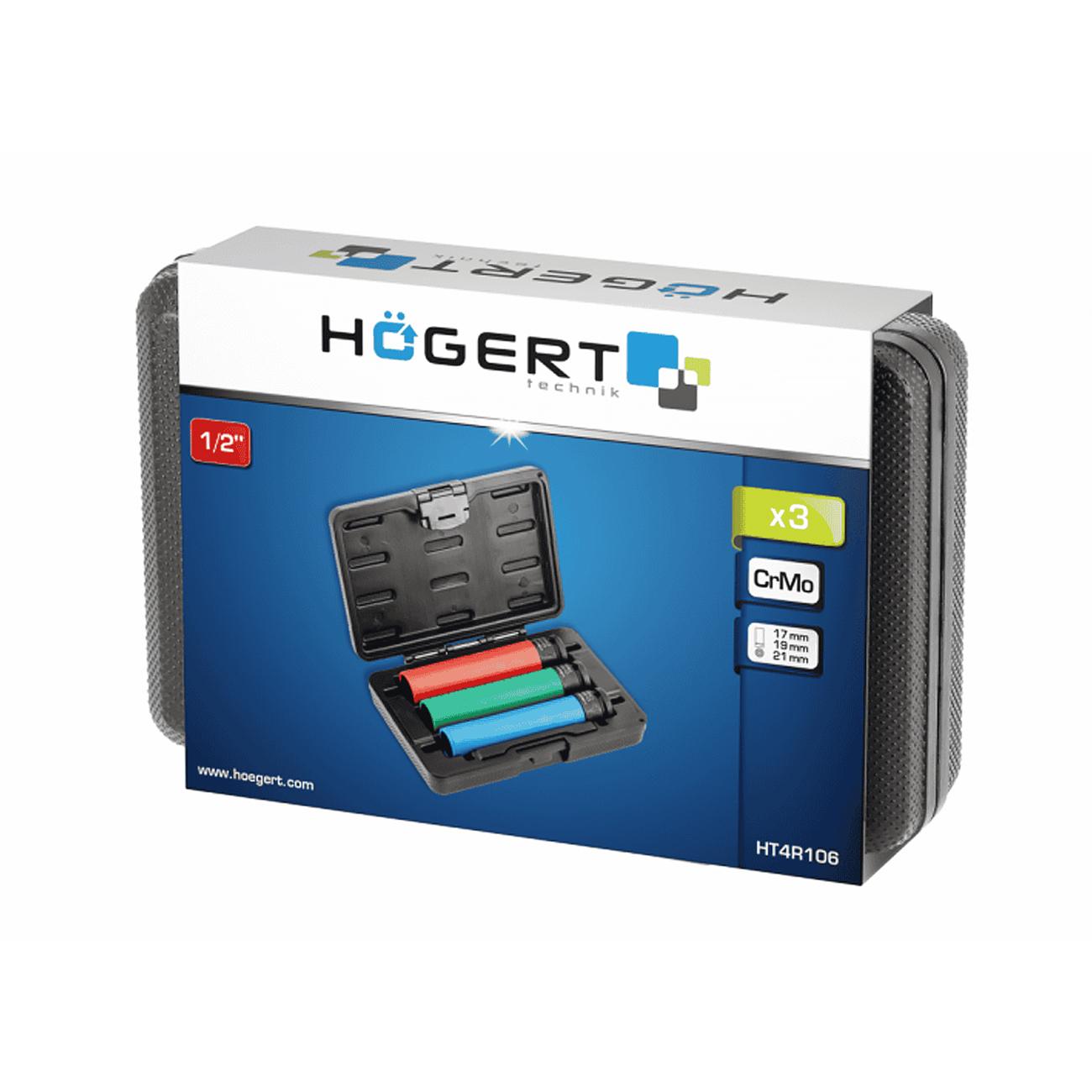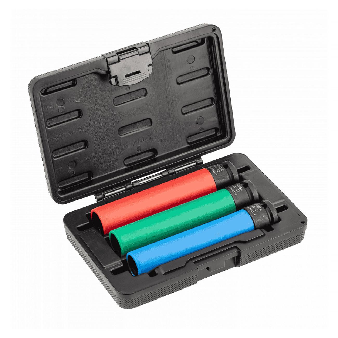 Комплект из трёх удлинённых ударных торцевых головок с посадкой 1/2″, предназначенный для работы с болтами на дисках (особенно легкосплавных) и крепёжом, требующим доступа в глубокие гнёзда. В набор входят головки размеров 17 мм, 19 мм и 21 мм. Длина каждой головки — 150 мм, что обеспечивает удобный доступ к гайкам и болтам в углублениях. Головки изготовлены из прочной легированной стали (CrMo / Cr‑Mo), устойчивой к нагрузкам, ударам и деформации.