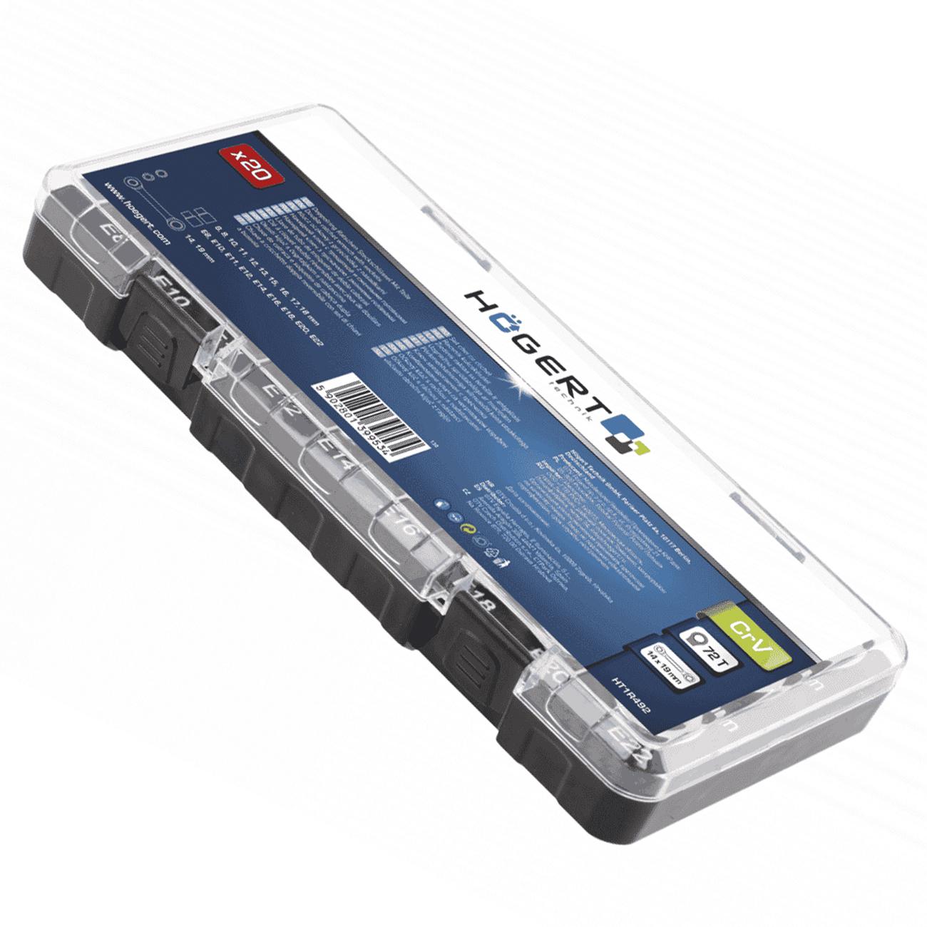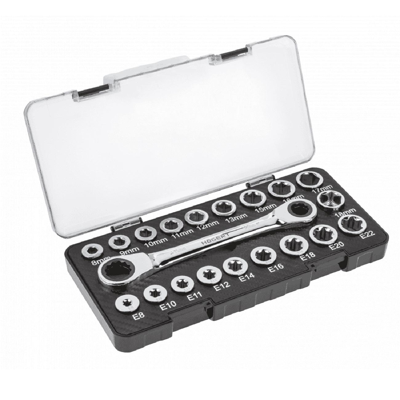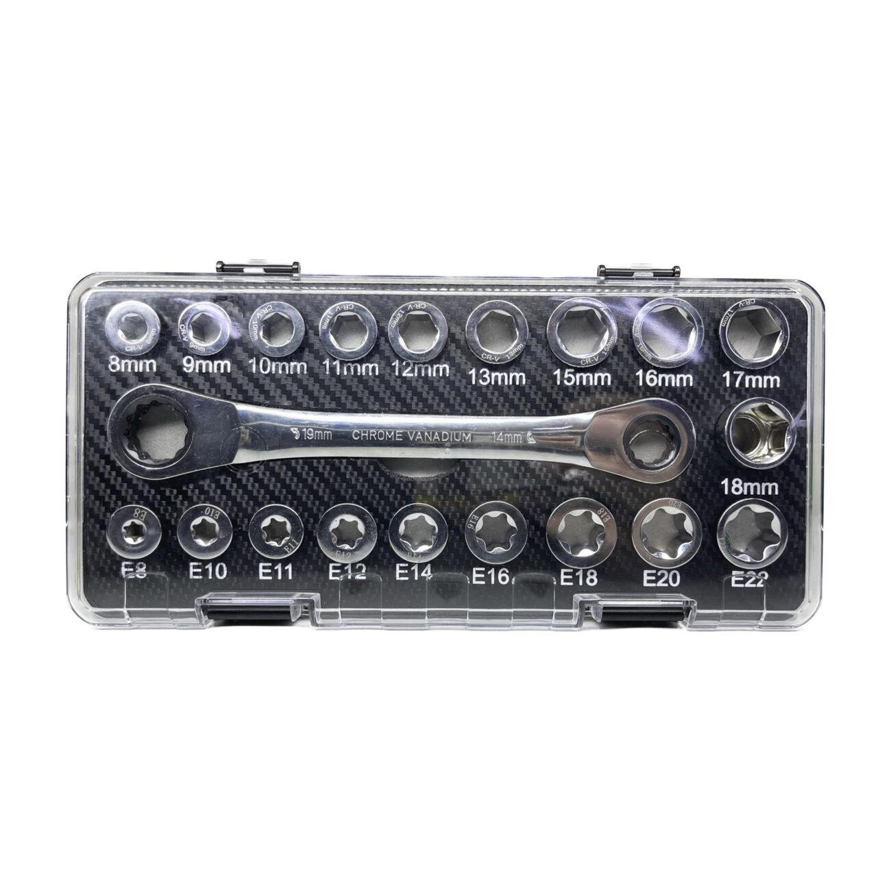 Универсальный набор: комбинированный ключ-трещотка + набор сменных насадок (шестигранных и Torx). В коробке 20 элементов, что позволяет работать с болтами и винтами разных стандартов: от 8 мм до 19 мм для шестигранных, и от E8 до E22 для Torx.
