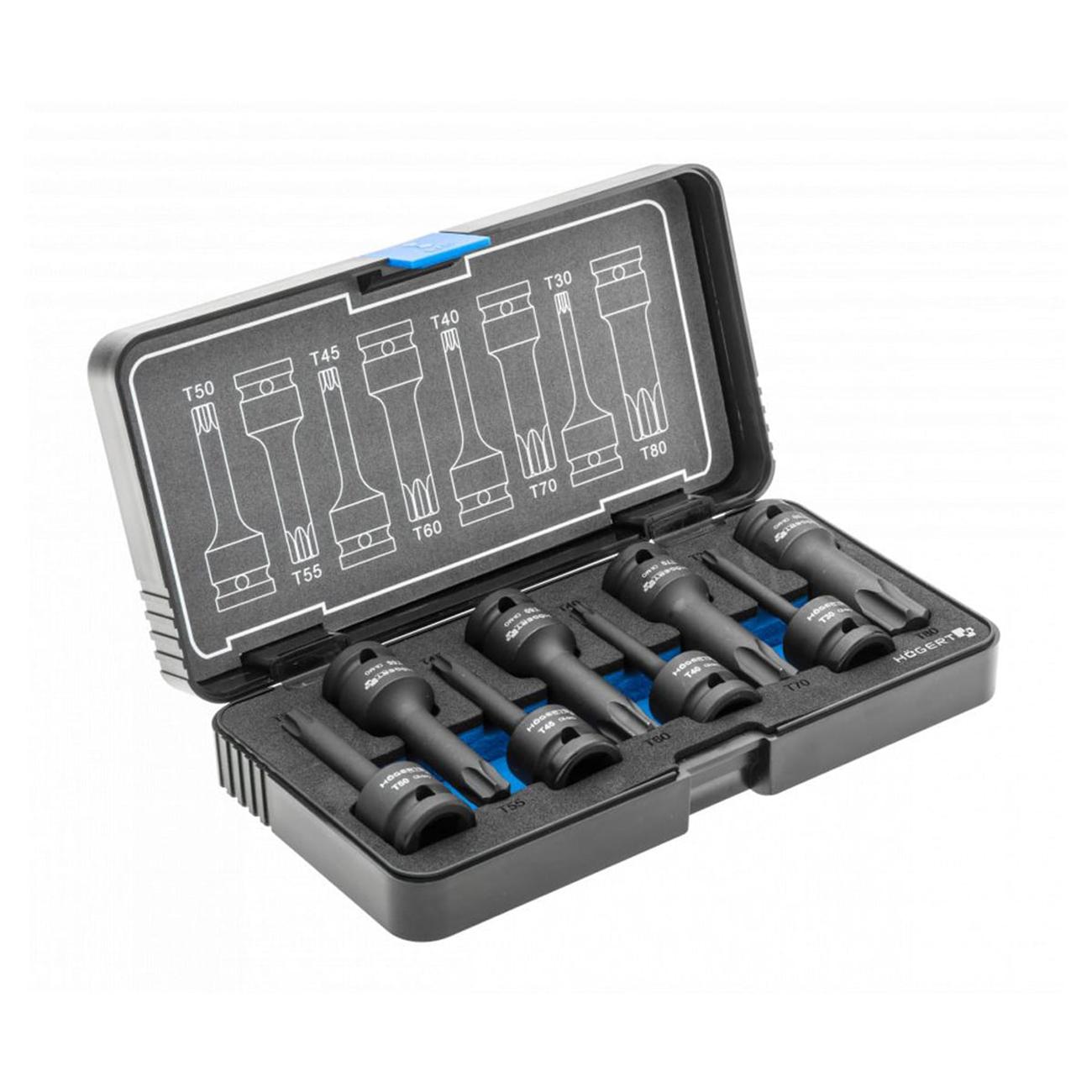 Это набор ударных торцевых головок с профилем Torx, с посадочным квадратом 1/2″ (12,7 мм). В состав входят 8 головок размеров от T30 до T80 (как T30, T40, T45, T50, T55, T60, T70, T80).