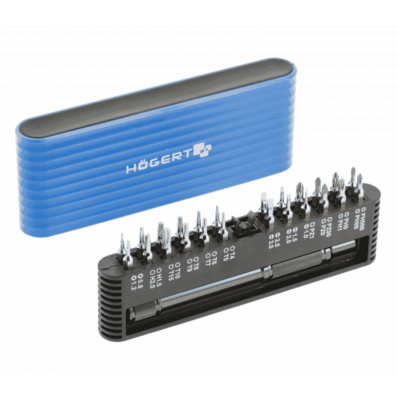 Это профессиональный набор из 25 бит и держателя‑адаптера 1/4″. Изготовлены из высокопрочной хром-ванадиевой стали (CrV) с твёрдостью 51–54 HRC, каждый бит выдерживает интенсивную эксплуатацию и сохраняет геометрию при нагрузках. В кейс входят SL‑, PH‑, PZ‑, TORX‑, HEX‑ и P‑типа биты, охватывающие наиболее часто используемые типы хвостовков: SL 1.0–3.0 мм, PH000–PH1, T4–T15, PZ00–PZ1, HEX H1.5–H2.0, и P0.8/P1.2.A20
