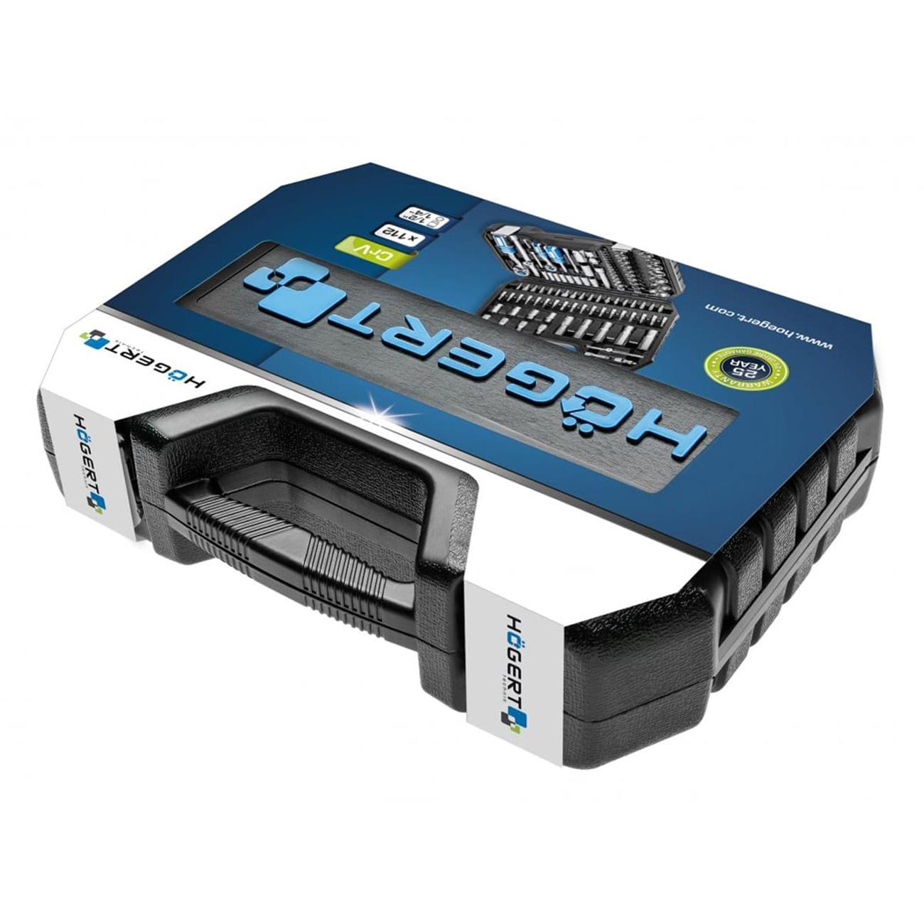 Профессиональный инструментальный набор включает 112 предметов: торцевые головки, биты, удлинители, держатели, гибкие удлинители, трещотки и шестигранники стандартных размеров. Все элементы выполнены из хром-ванадиевой стали (CrV), храповый механизм трещоток на 72 зуба изготовлен из CrMo, что гарантирует надежность даже при интенсивной эксплуатации. Инструменты аккуратно размещены в прочном пластиковом кейсе с металлическими замками и петлями.