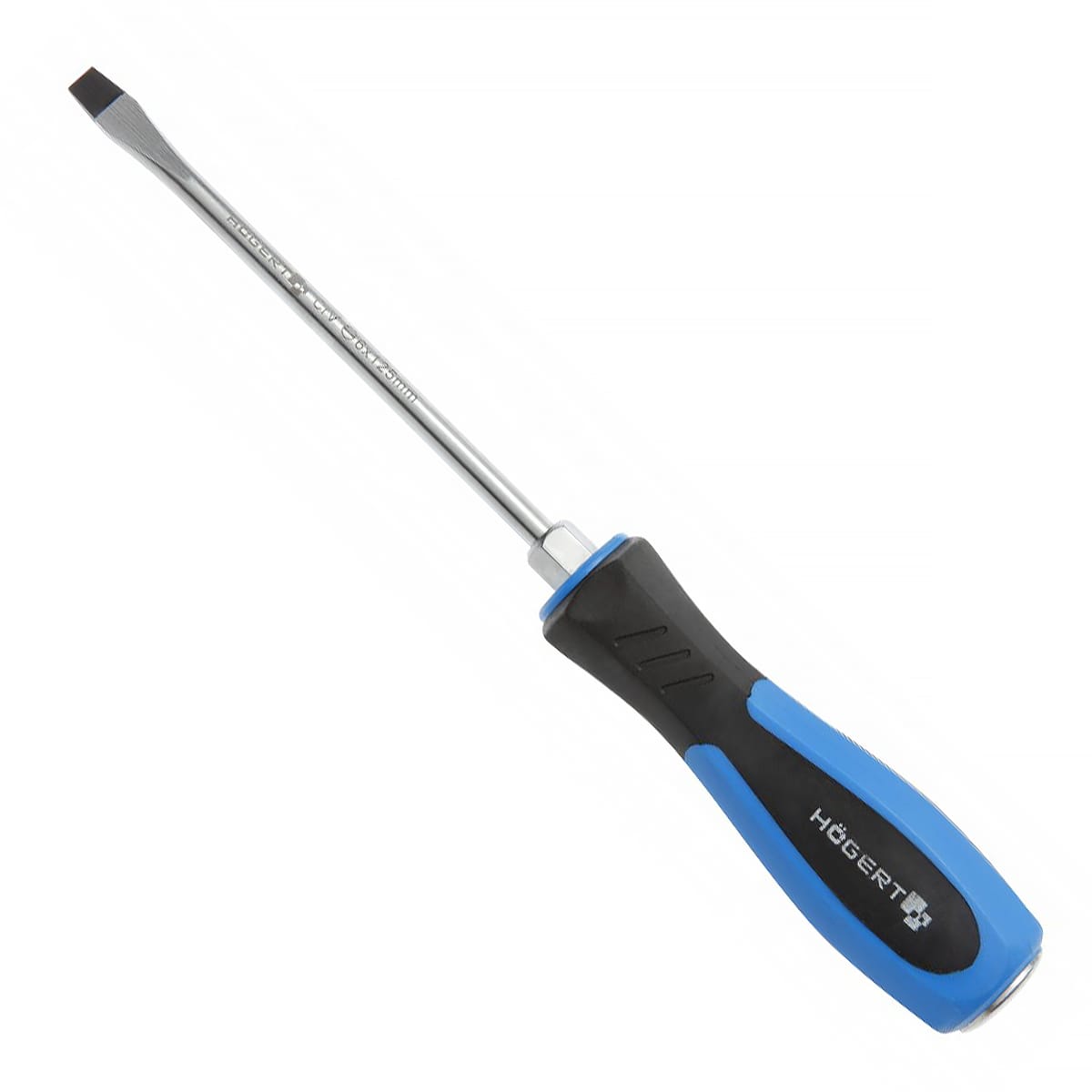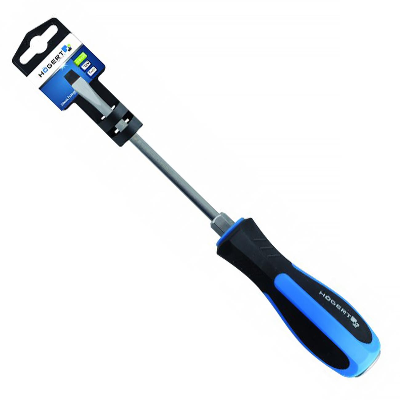 Плоская отвертка с рабочим наконечником, оснащена прочным металлическим затыльником для ударов молотком по рукояти. Наконечник и корпус выполнены из высококачественной хром‑ванадиевой стали (CrV), что обеспечивает надёжность и устойчивость к деформации. Удобная эргономичная двухкомпонентная ручка с противоскользящим покрытием повышает комфорт и контроль при работе. В основании рукоятки встроен шестигранный фланец, позволяющий максимизировать крутящий момент при затягивании.