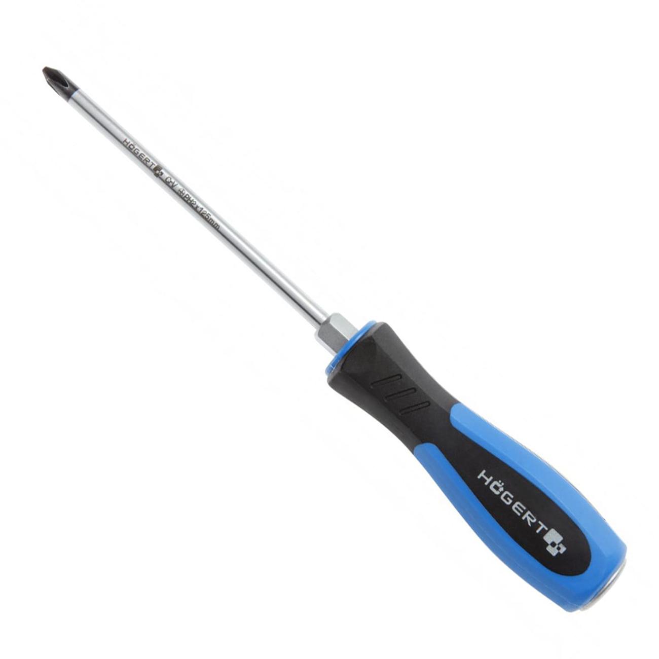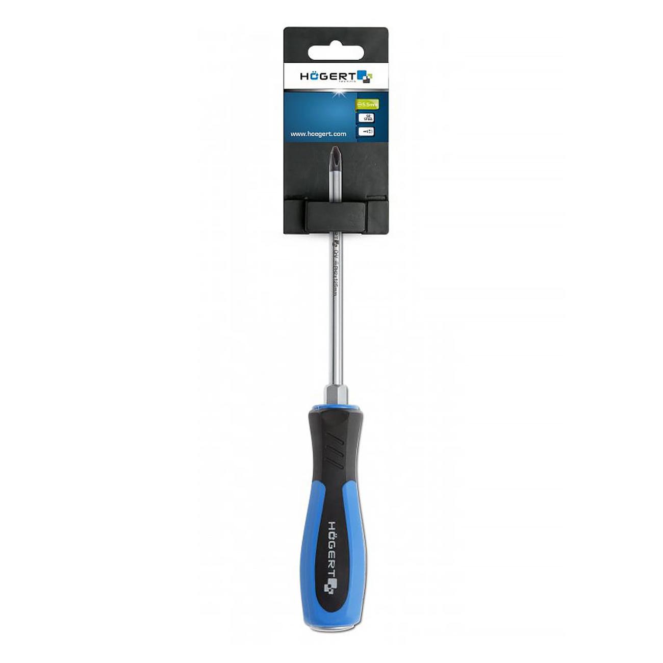 Ударная крестовая отвёртка оснащена рабочим наконечником PH2 длиной 125 мм. Изготовлена из высококачественной хром-ванадиевой стали (Cr‑V), оснащена металлическим ударным наконечником, позволяющим наносить удар молотком по рукояти при заклинивании крепежа. Магнитное жало надёжно удерживает винт в головке. Рукоять эргономичная, двухкомпонентная, с рифлёной прорезиненной поверхностью и широкий шестигранный фланец в основании для увеличения крутящего момента. Вес изделия — около 137 г.