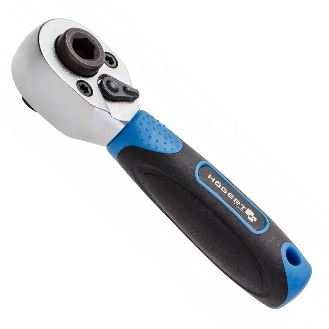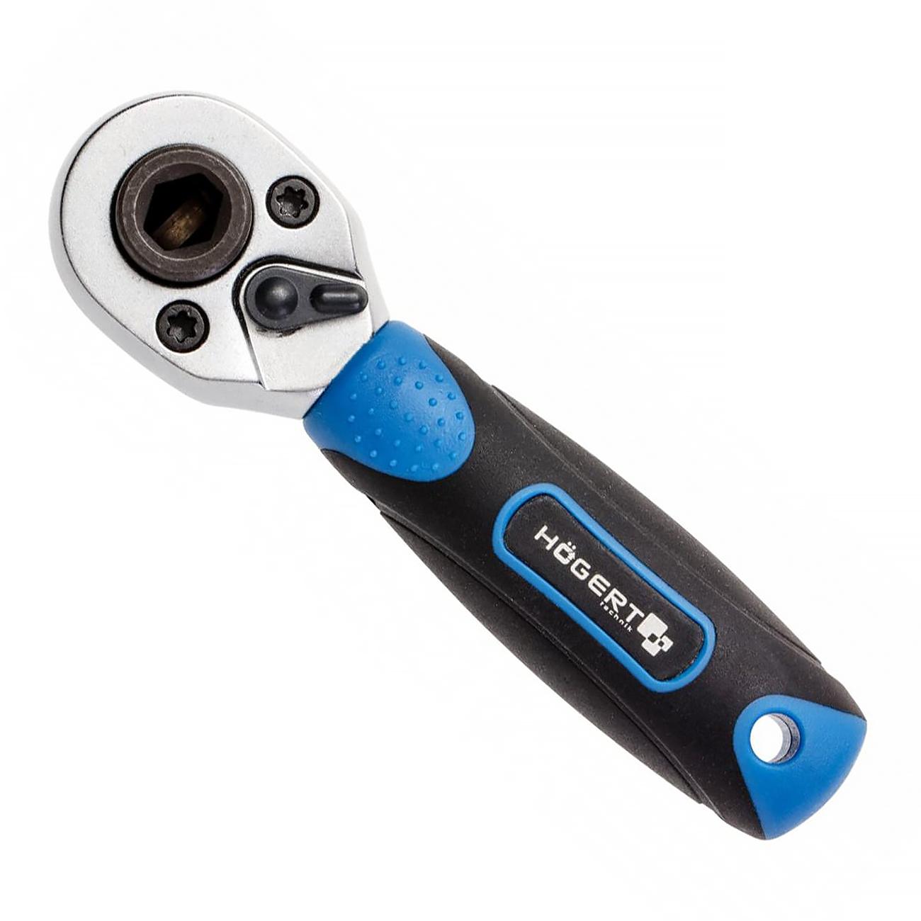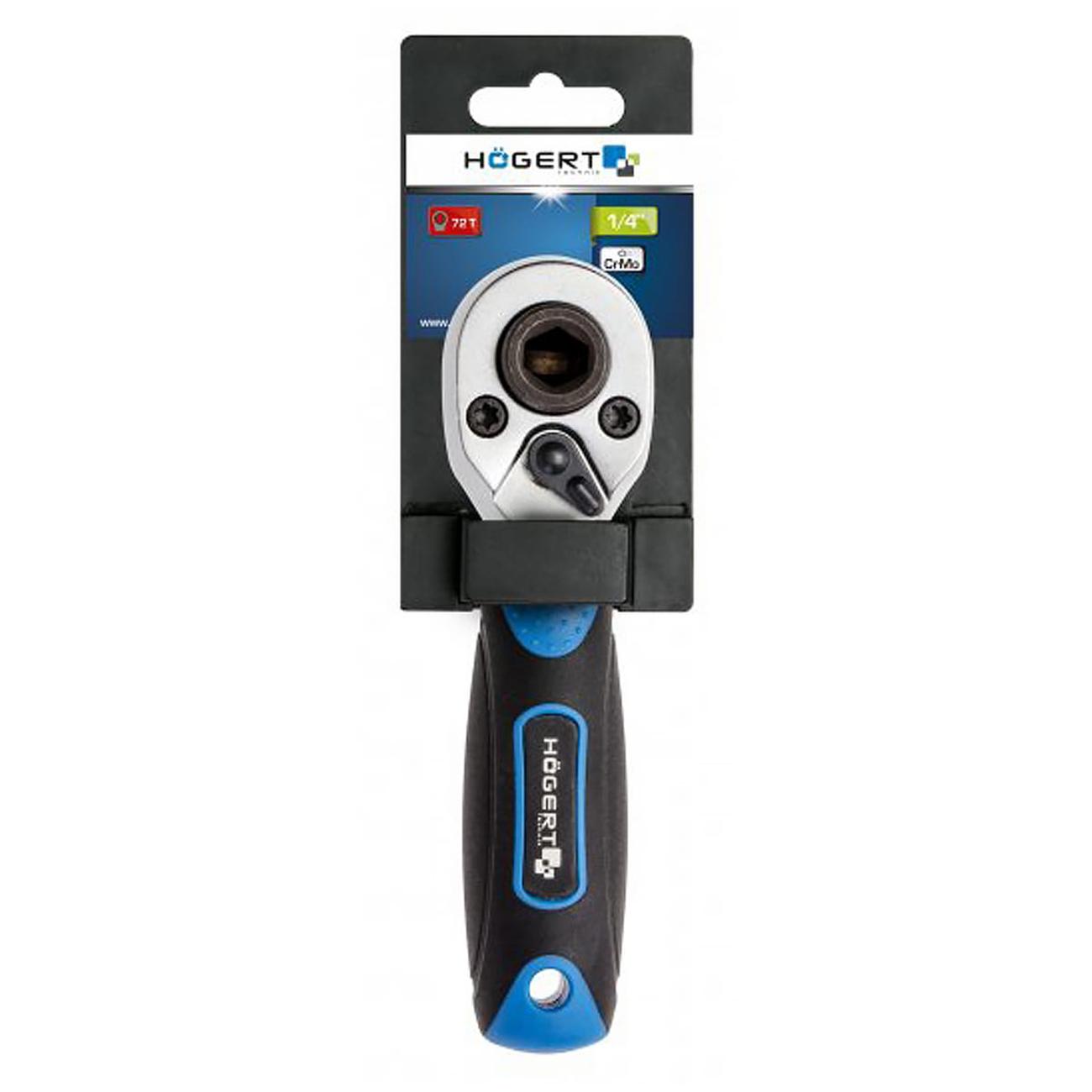 Компактная и мощная ручная трещоточная рукоять с 1/4 приводом (6.3 мм), пригодная для бит и торцевых головок. Корпус выполнен из прочной Cr V‑стали, а механизм из CrMo‑сплава (хром-молибденовая сталь), содержит 72 зубца, обеспечивающие минимальный угол поворота (~5°) даже в ограниченном пространстве. Профиль рукояти — эргономичный, bi-material, с анти скользящим покрытием. В конце предусмотрен пластиковый подвес. Подходит для бит и головок без необходимости смены ключа.
