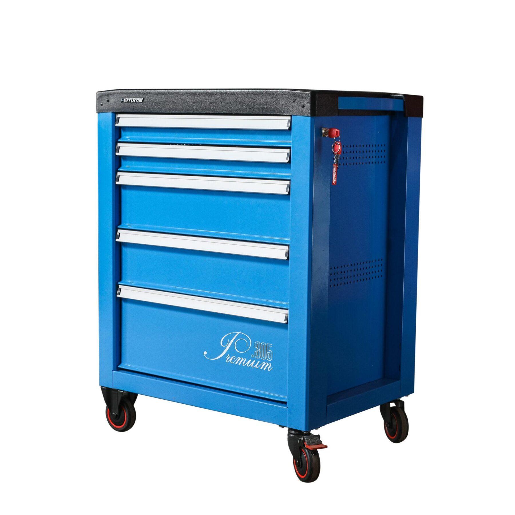Тележка FERRUM Premium 12.305-5015/5015 оснащена пятью выдвижными ящиками, боковыми перфорационными панелями и крышкой из ударопрочного пластика с держателем для инструментов. Разработана для мобильного и безопасного хранения инвентаря в мастерских, СТО и производственных помещениях.
