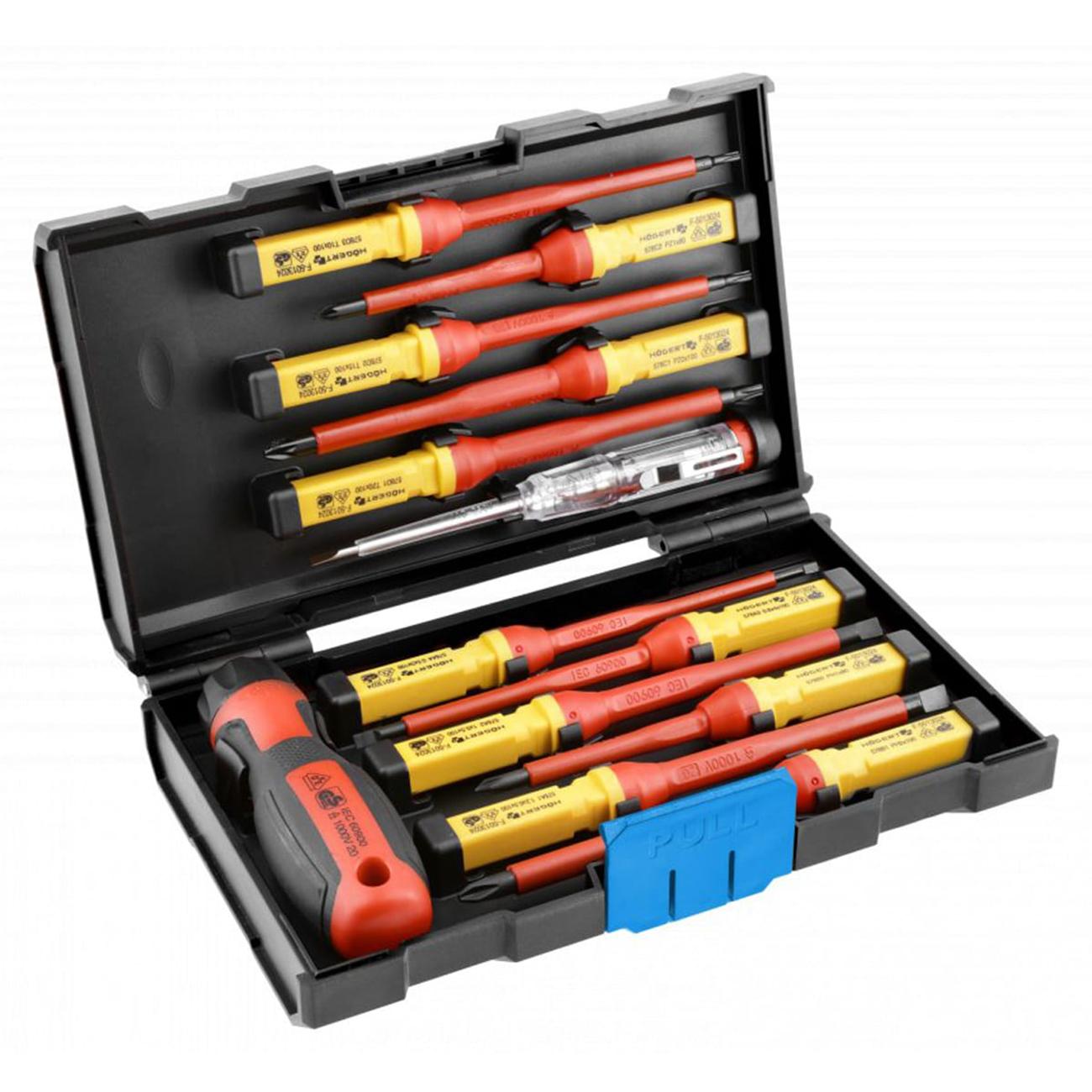 Это набор из 13 изолированных отверток, предназначенный для безопасной работы с электрическими установками до 1000 В AC. Инструмент имеет сменные насадки и выдерживает стандарты EN 60900 / VDE, обеспечивая надёжную защиту и максимальную безопасность при работе под напряжением. Отвертки поставляются в компактной пластиковой упаковке, дополненной ручкой для переноски и встроенным индикатором напряжения.