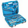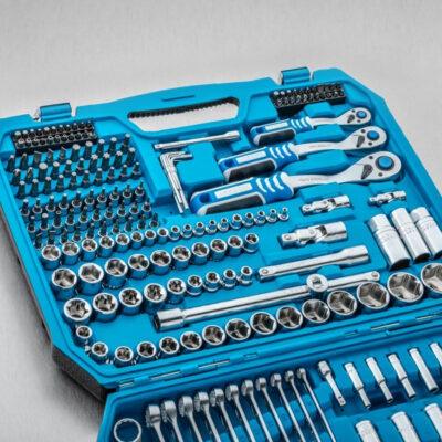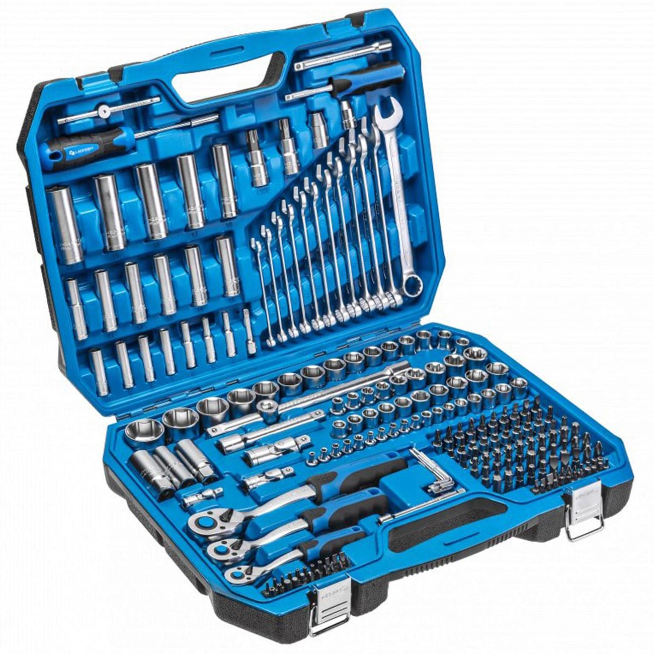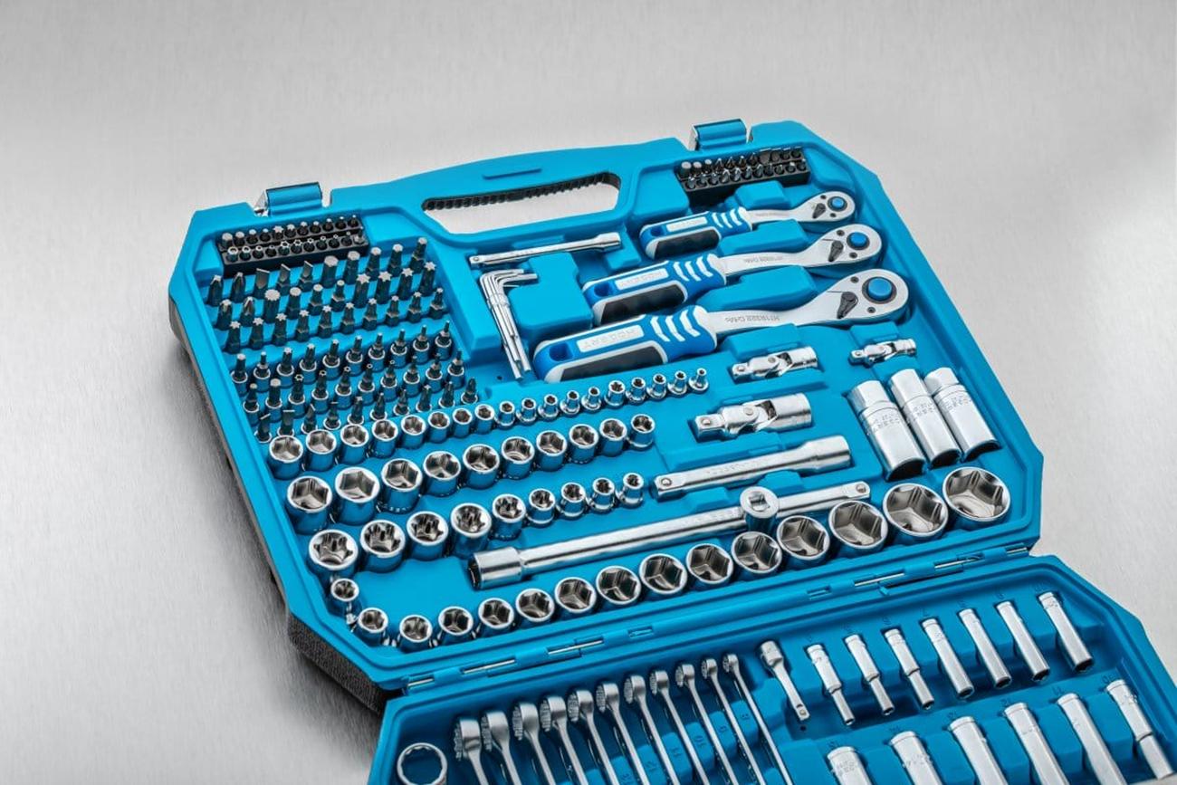 Профессиональный комплект включает 222 инструмента: торцевые головки, трещотки, отверточные биты, адаптеры, шестигранные ключи, комбинированные ключи, удлинители и аксессуары под приводы 1/4″, 3/8″ и 1/2″. Все элементы выполнены из хром‑ванадиевой стали (CrV) методом ковки с высокими эксплуатационными свойствами. Трещоточный механизм — из хром‑молибденового сплава (CrMo) с 72 зубьями, что обеспечивает точность даже при минимальном угле поворота (~5°). Расположен удобно в двухцветном пластиковом кейсе с металлическими замками и петлями.