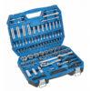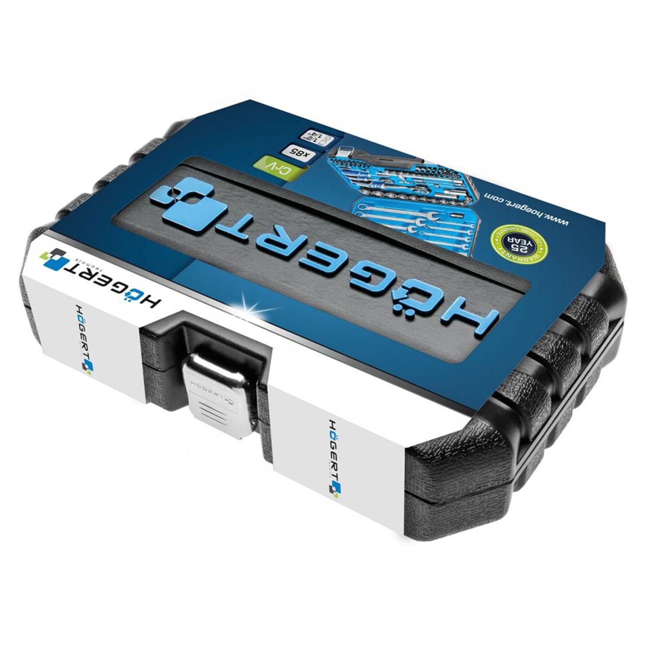 Профессиональный инструментальный комплект содержит 85 предметов — торцевые головки, биты, удлинители, держатели, трещотки, комбинированные ключи и аксессуары под приводы 1/4″ и 1/2″. Все компоненты изготовлены из прочной хром-ванадиевой стали (CrV), а механизм трещотки выполнен из CrMo с 72‑зубым механизмом для работы даже при минимальных углах поворота. Инструменты упакованы в прочный пластиковый кейс двухцветного дизайна с металлическими замками и петлями.