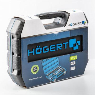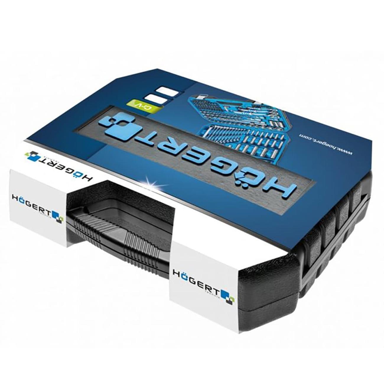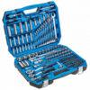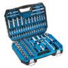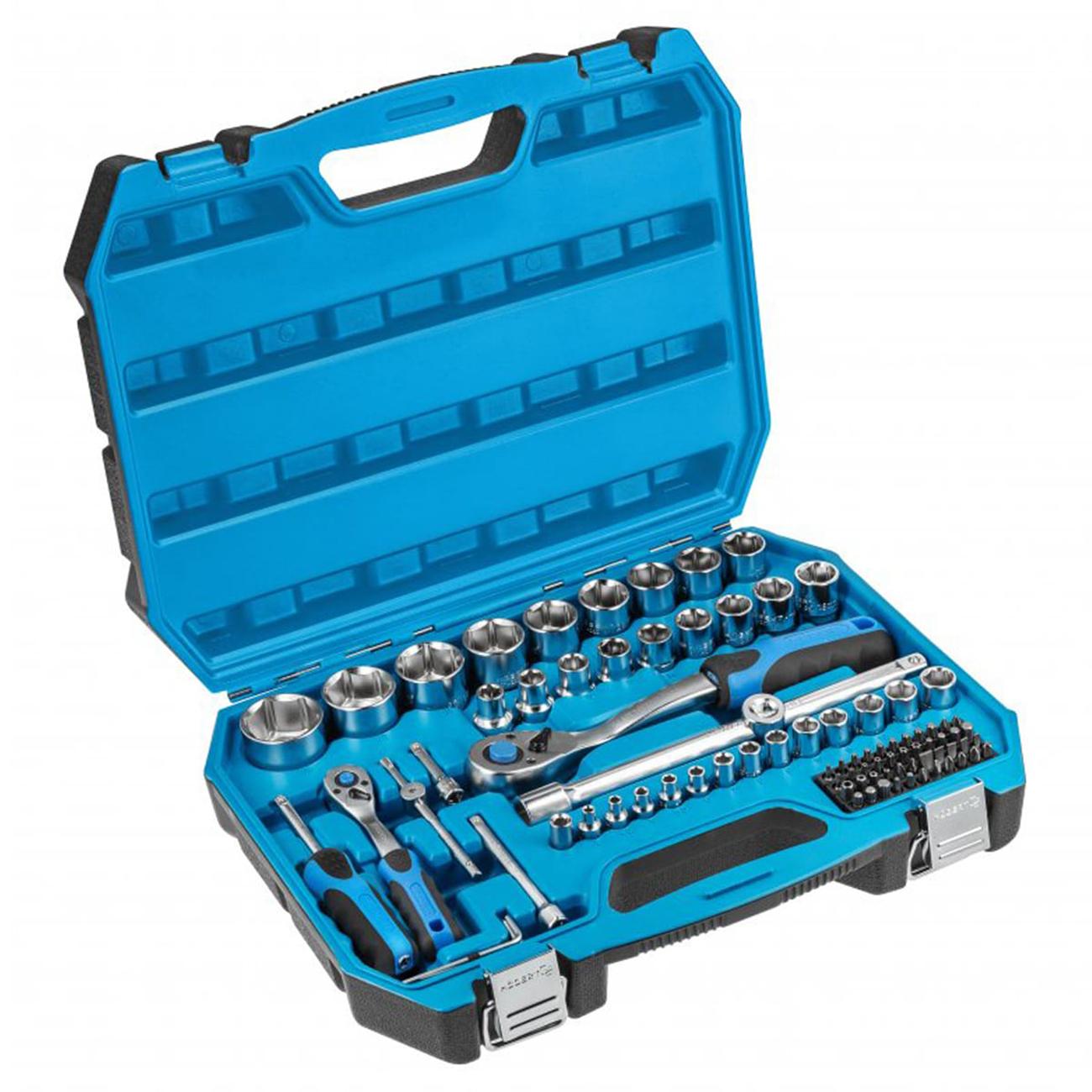 Универсальный набор включает 89 инструментов: торцевые головки, отверточные биты, трещотки, адаптеры, шестигранники и необходимые аксессуары под приводы 1/4″ и 1/2″. Все элементы изготовлены из качественной хром-ванадиевой стали (CrV), а механизм трещоток — из CrMo‑сплава с 72 зубьями, обеспечивающим точную работу даже при минимальном угле поворота (~5°). Инструменты уложены в практичный двуцветный пластиковый кейс с металлическими замками и петлями для надёжного хранения.