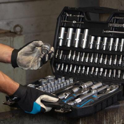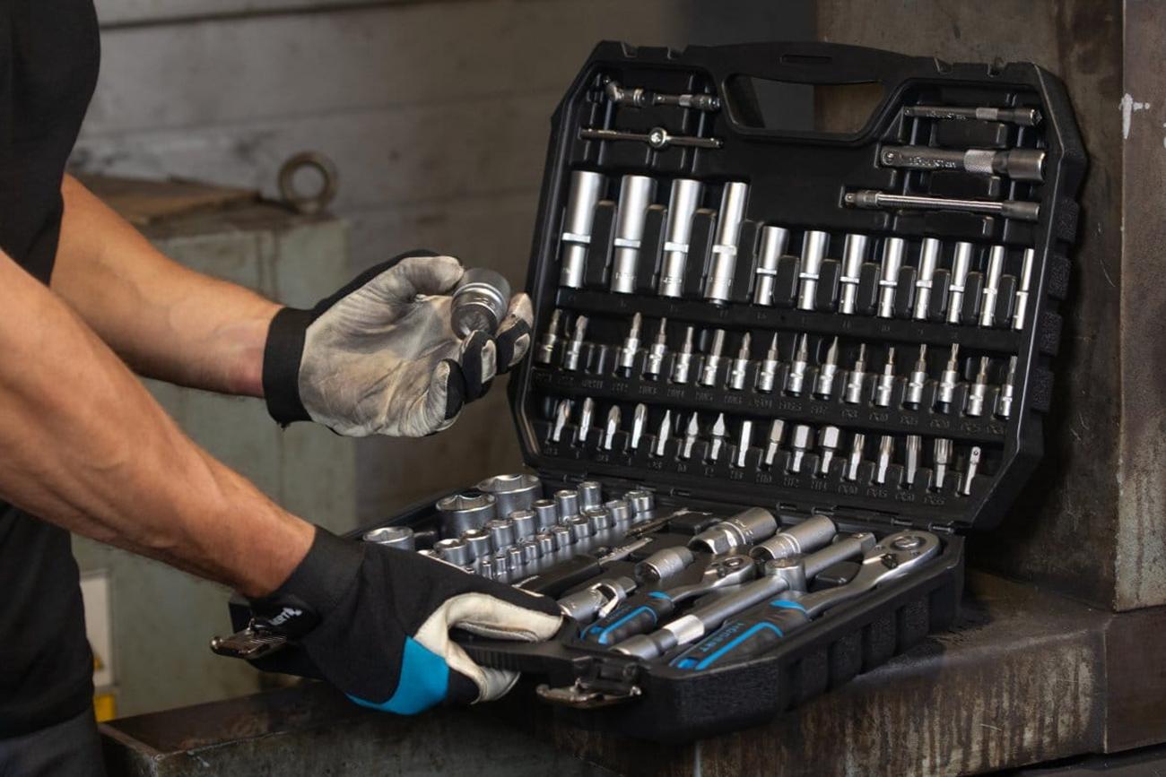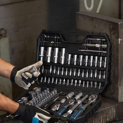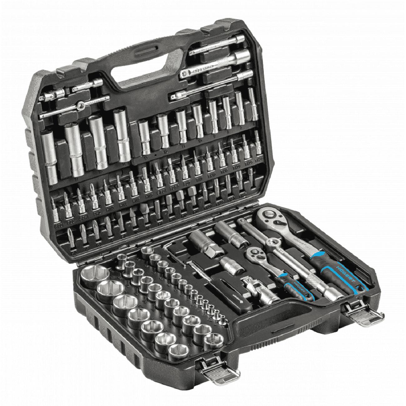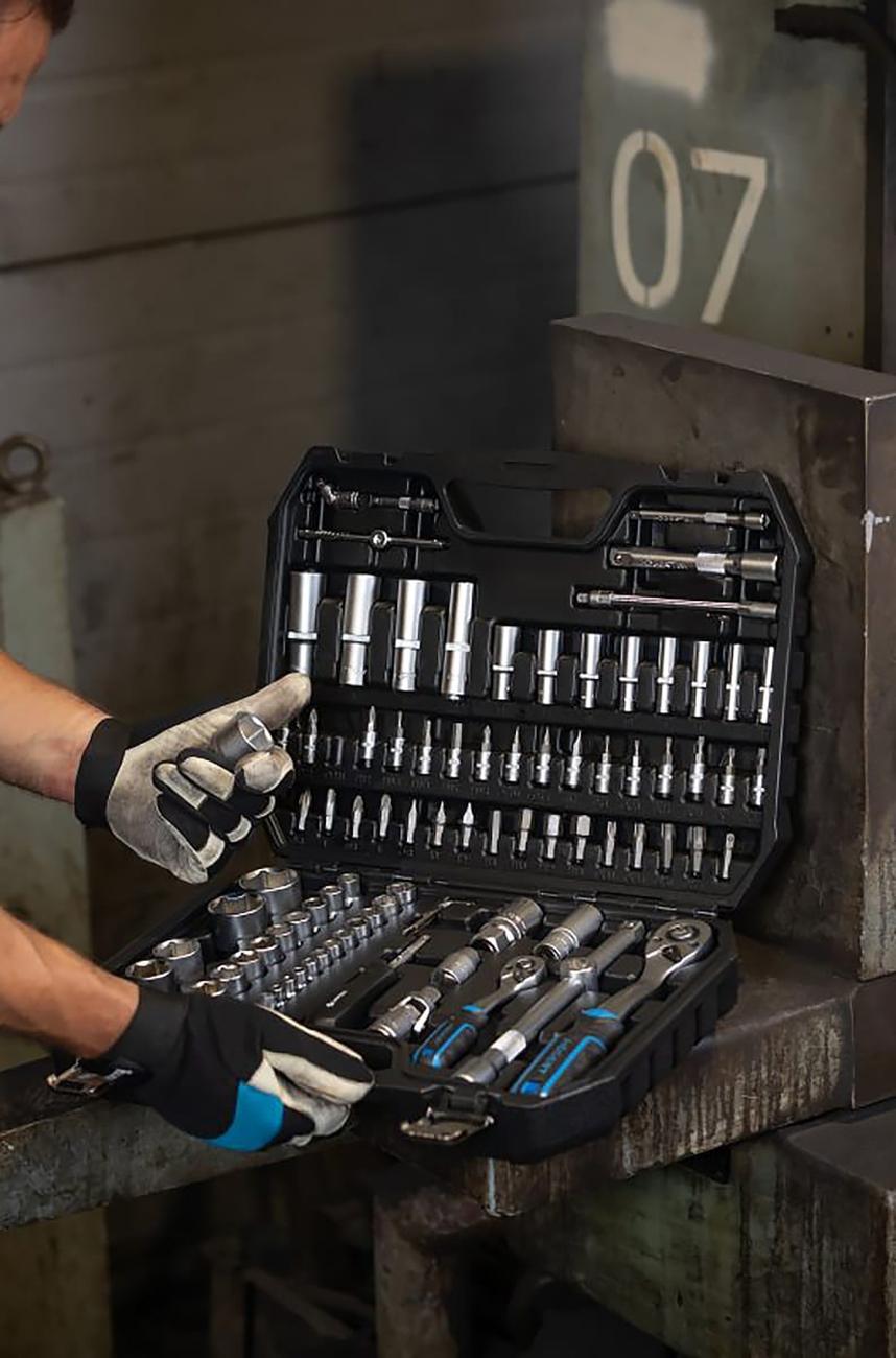 Профессиональный инструментальный набор включает 95 предметов, объединённых в удобный прочный кейс с металлическими замками. Включены торцевые головки, биты, трещотки, адаптеры, шестигранники и аксессуары под приводы 1/4″ и 1/2″. Все элементы изготовлены из хром-ванадиевой стали (CrV), трещотки — из CrMo с 72‑зубым механизмом для надёжной работы под нагрузкой.
