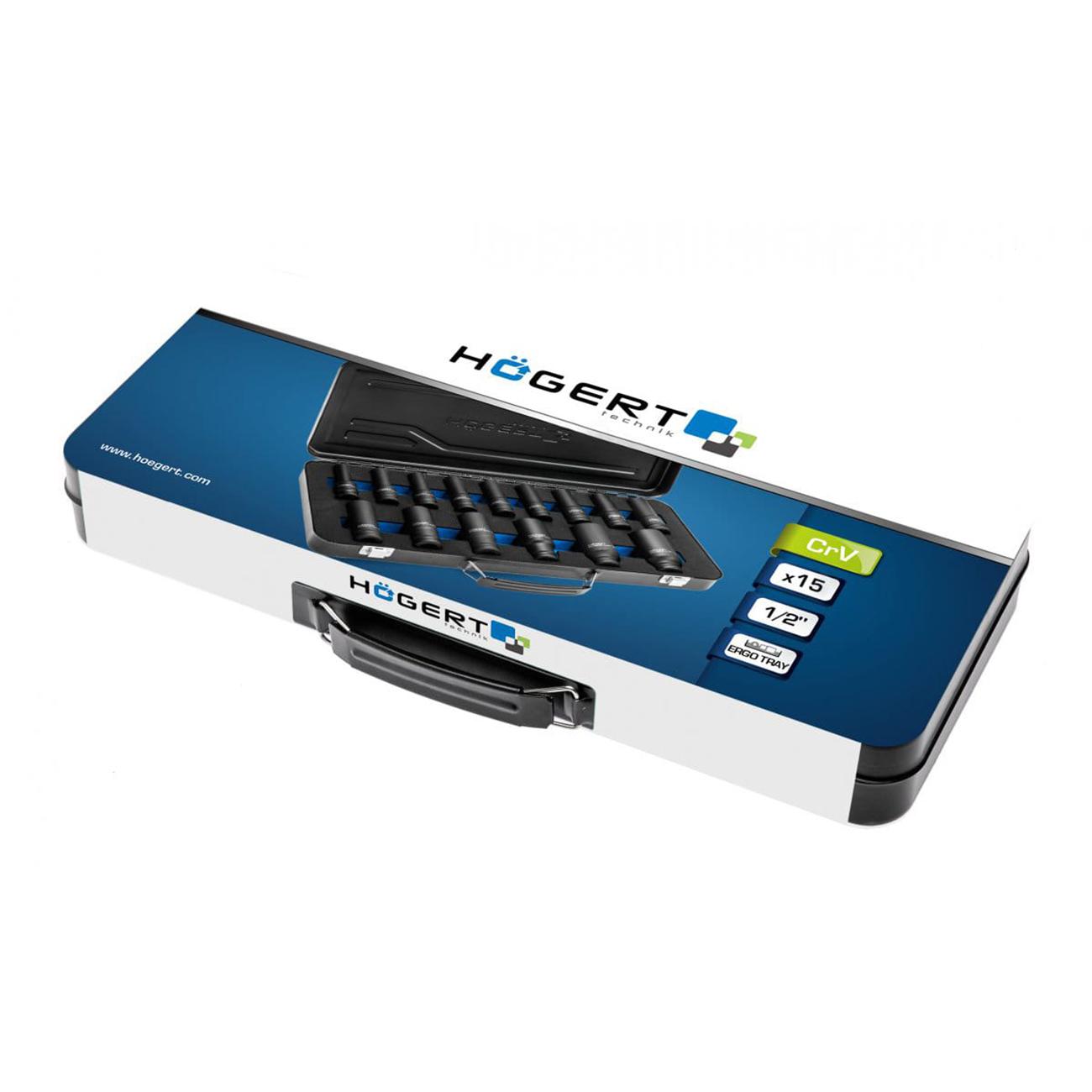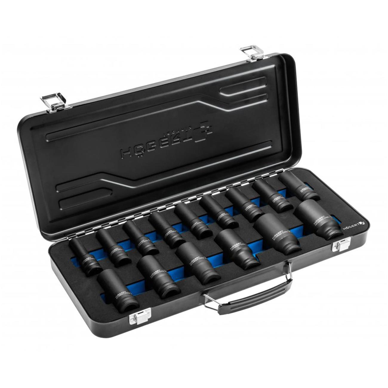 Набор ударных глубоких шестигранных торцевых головок 1/2″. В комплект входит 15 головок разных размеров (от 10 мм до 32 мм), выполненных из закалённой хром-молибденовой стали (CrMo), и рассчитанных на эксплуатацию с ударным инструментом (гайковёрт, пневмогайковёрт и пр.). Головки имеют удлинённый корпус (до ~78 мм), что облегчает доступ к крепежу в труднодоступных и узких местах. Все элементы упакованы в прочном металлическом кейсе для удобства хранения и транспортировки.