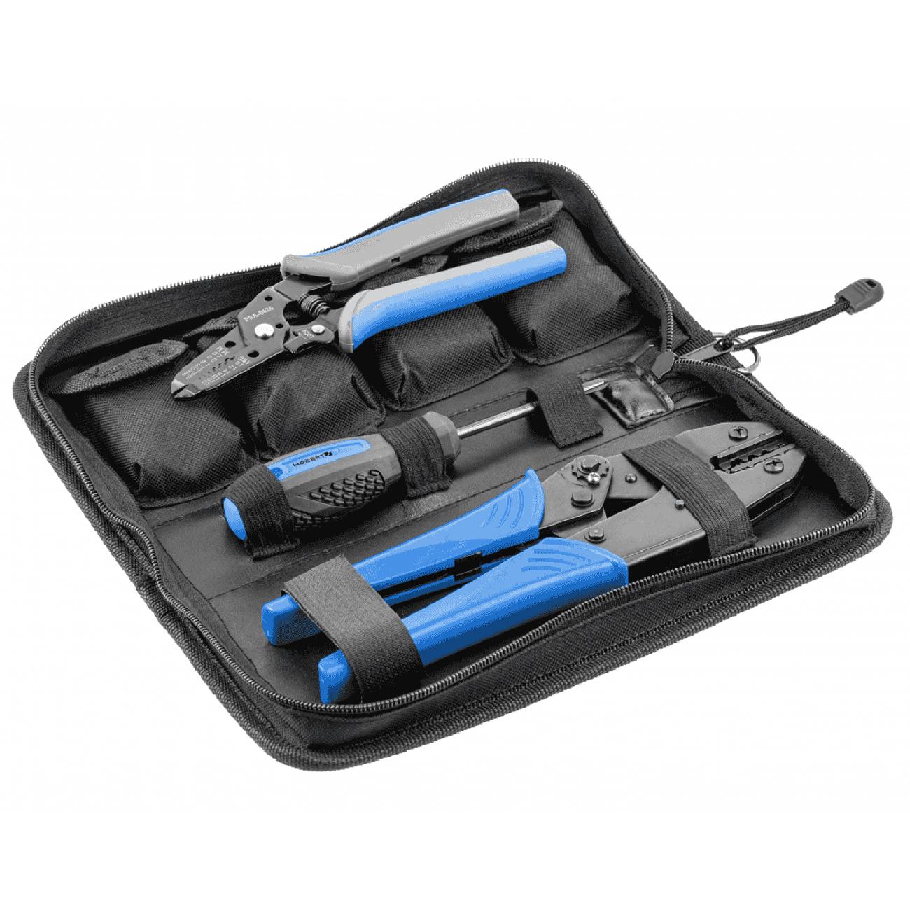 Профессиональный набор обжимного инструмента с 5 сменными матрицами, встроенным стриппером и храповым механизмом. Комплексное решение для электромонтажников и специалистов по автомобильной и коммуникационной сети. Надёжность, компактность и эргономика делают его незаменимым в работе.